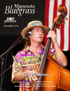 The December issue features a cover story interview with Pete Mathison, tab for Angeline the Baker from Steve Kaufman, as well as the regular columns: Bluegrass Saturday Morning, the Minnesota Bluegrass Calendar of Events, the Coming Up section.