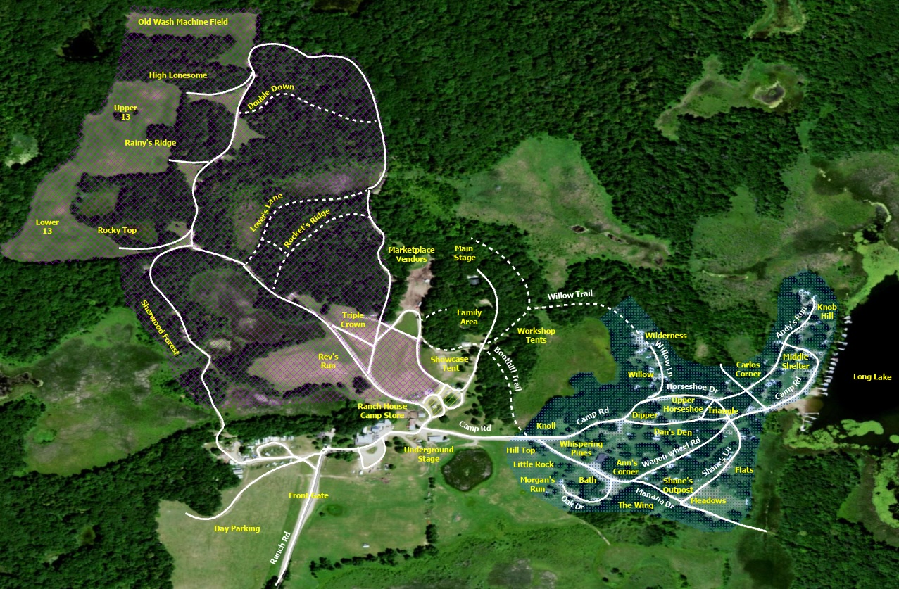- Old Wash Machine Field (or just Old Wash): Named for the literal old washing machine someone found when the site was originally being cleared, if you love hanging out and playing music all day and all night, this is the spot for you! Campers, tents, RVs are all welcome. There are often a number of communal canopies where you can share in a pot-luck feast, and get to know new friends. This is a No Generator area.
